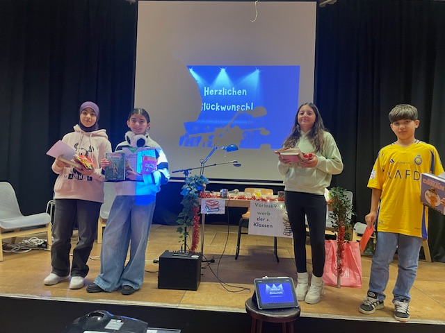 Am Montag, den 08.12.2025 fand der diesjährige Schulentscheid des Vorlesewettbewerbs der 6. Klassen am GENO statt. Für ihre Klassen traten die Klassensieger Ebrar Yildiz (Klasse 6a), Ouafa Al Omari (Klasse 6b), Amir Ali Hussein (Klasse 6c) und Amal Zahri (Klasse 6d) an. Am Ende setzte sich Ebrar, die besonders im ersten Teil sehr lebendig aus „Ronja Räubertochter“ vorlas, gegen die anderen Lesenden als Schulsiegerin durch! Sie wird das GENO jetzt beim Stadtentscheid vertreten – dazu wünschen wir ihr viel Erfolg!